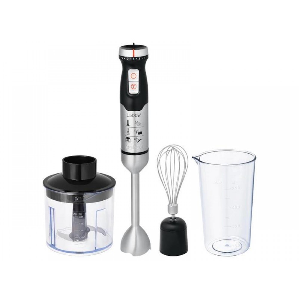 Живлення - 220-240В, 50Гц, потужністю 1500 W. 2 швидкісних режиму роботи. Режим TURBO. Регулятор швидкості на корпусі. Ніж з нержавіючої сталі з титановим покриттям Ice Crush . Пластиковий корпус зі знімною ногою. Нога з нержавіючої сталі. Петля для підвішування. Аксесуари: чаша з подрібнювачем 500 мл, мірний стакан 700 мл, віночок. Колір: чорний.