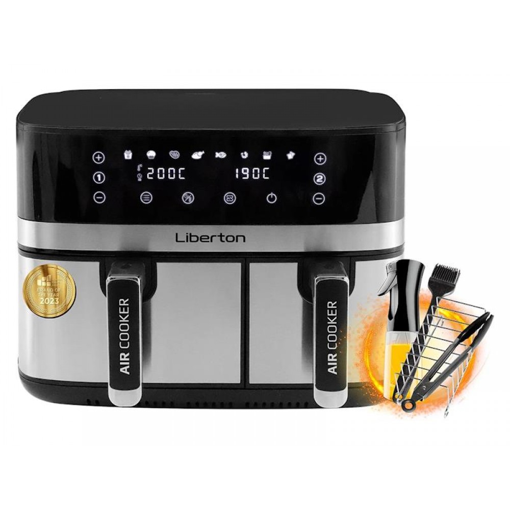 Потужність: 2700 (1650+950) Вт; Об'єм чаші: 9,0 (5,5+3,5) л; Функції: 5 (фритюр, смаження, гриль, випічка, розігрів); Автоматичні програми: 8 (картопля фрі, випічка, м'ясо, ціла курка, риба, креветки, овочі, тости); Діапазон температур: 80-200 град.; Особливості: приготування двох страв одночасно; Тип керування: сенсорне; Тип нагрівального елемента: електричний; Додатково: термостат, таймер, антипригарне покриття чаші, автовідключення, захист від перегріву; Розмір виробу: 41,7х31х39, 2 см; Колір чорний.