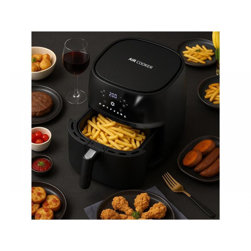 Потужність: 1500 Вт; Об'єм чаші: 5,0 л; Функції: 5 (випічка, смаження, гриль, розігрів, фритюр); Автоматичні програми: 8 (картопля фрі, стейк, риба, куряче стегно, випічка, овочі, креветки, піца); Діапазон температур: 80-200 град.; Тип управління: сенсорне; Додатково: термостат, таймер, антипригарне покриття чаші, відключення, захист від перегріву; Тип нагрівального елемента: електричний тен; Розмір виробу, см: 33,6х31,1х27,0; Колір: чорний.